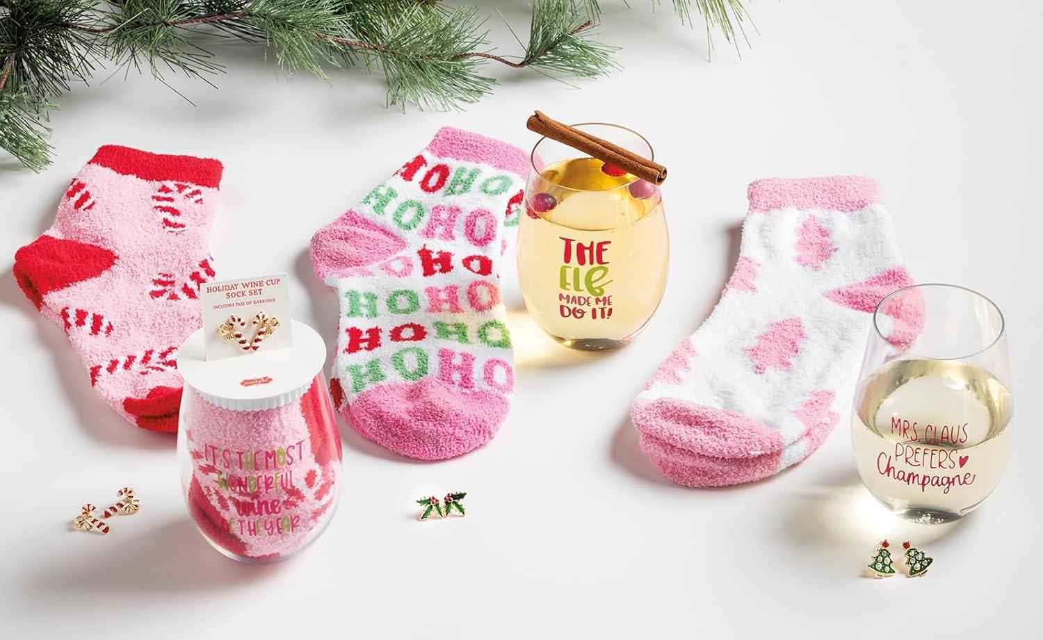 Mud Pie Women’s Holiday Wine Set, Pink, Cup 16 oz | Socks one Size | Earrings Approx 1/2″