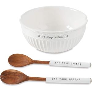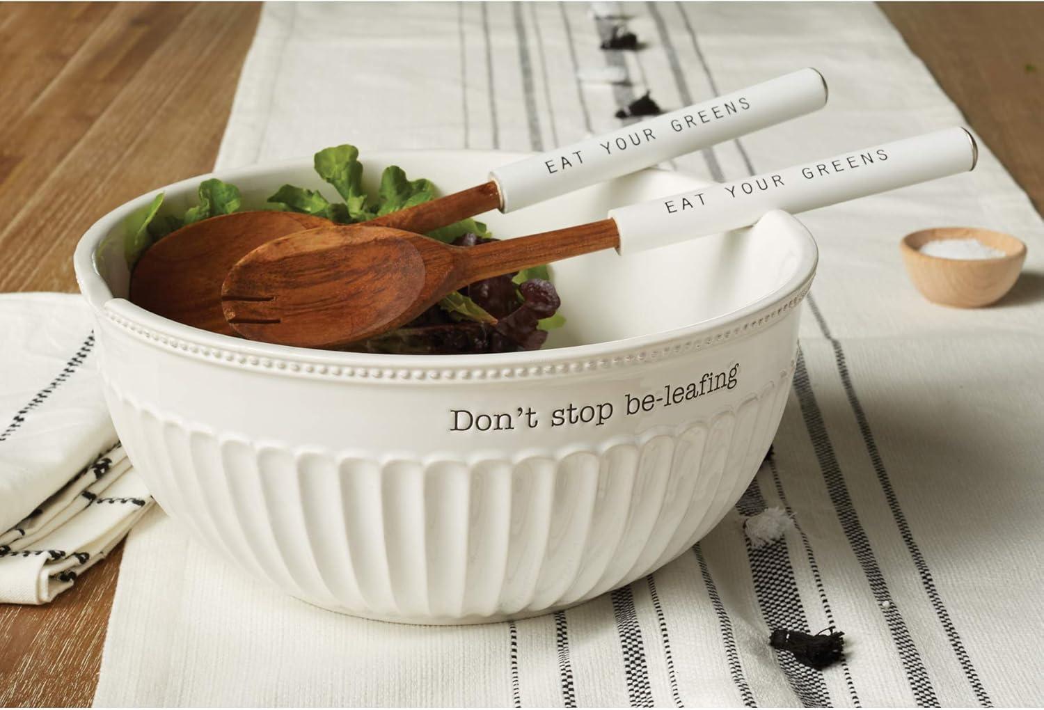 Mud Pie Dolomite, wood Don’t Stop Be-Leafing Salad Bowl Set, 32 oz, White, brown
