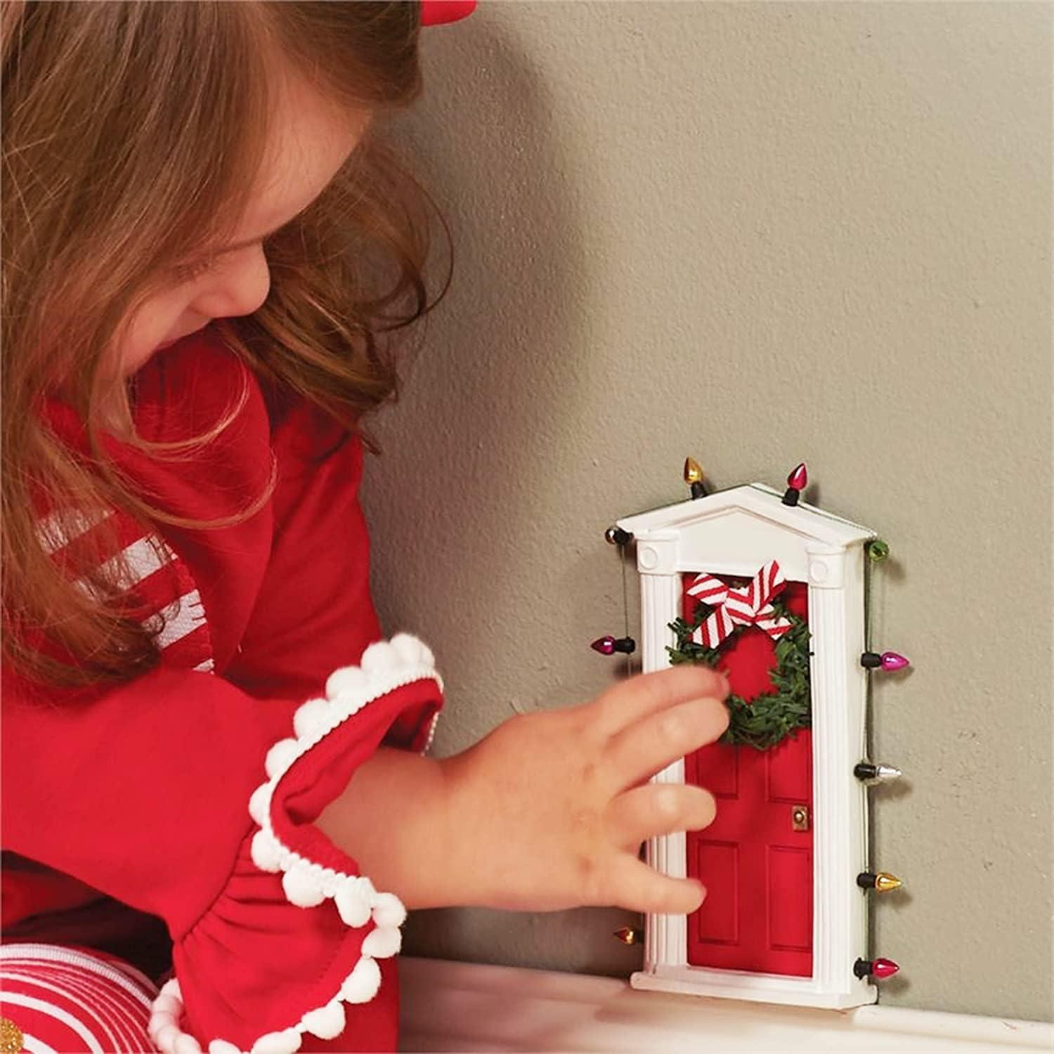 Standing miniature dimensional door surrounded with “lights” and tiny faux wreath with bow allows special entry for fairies and elves