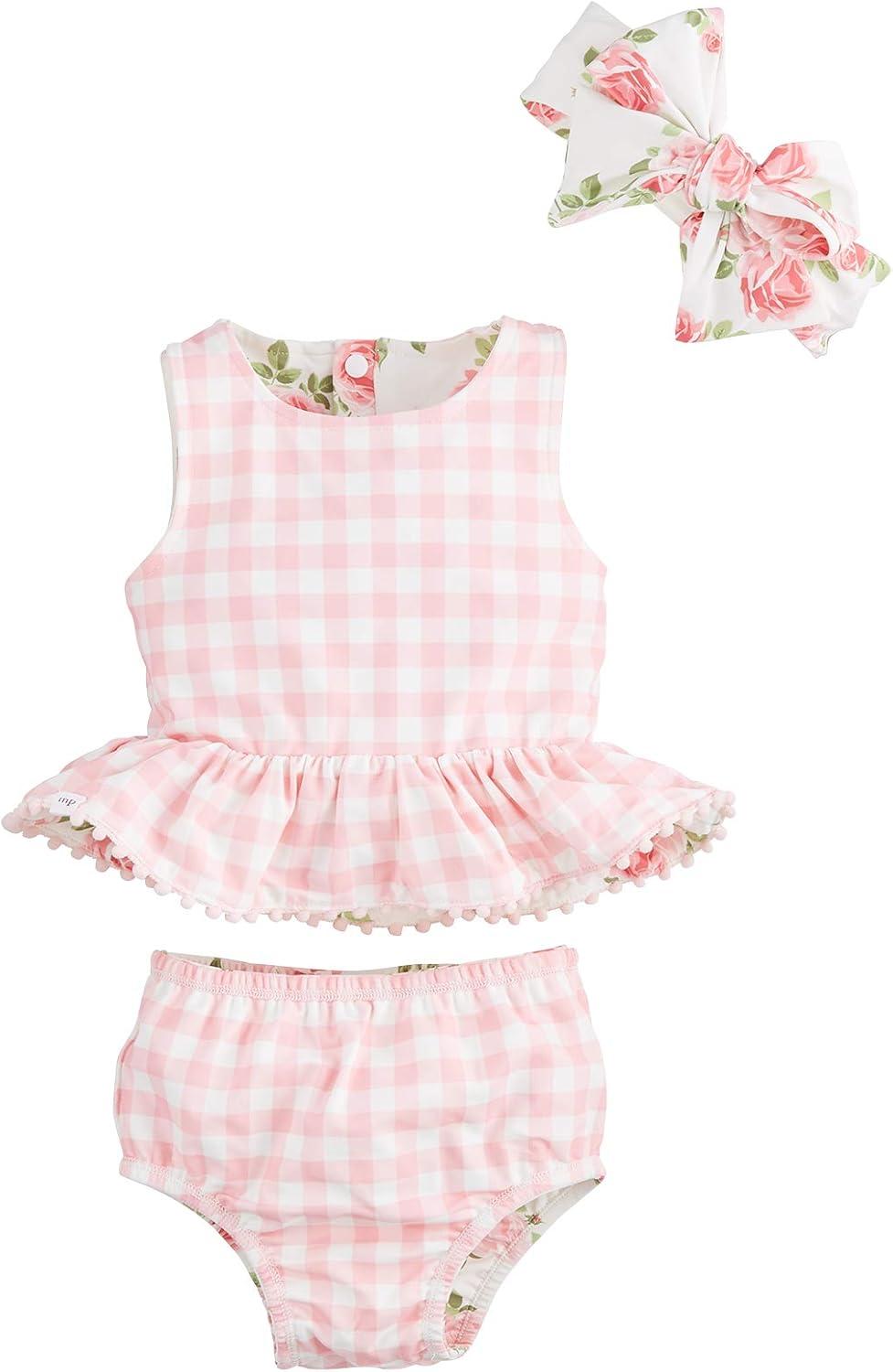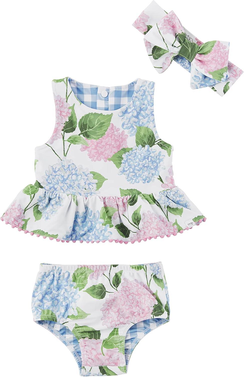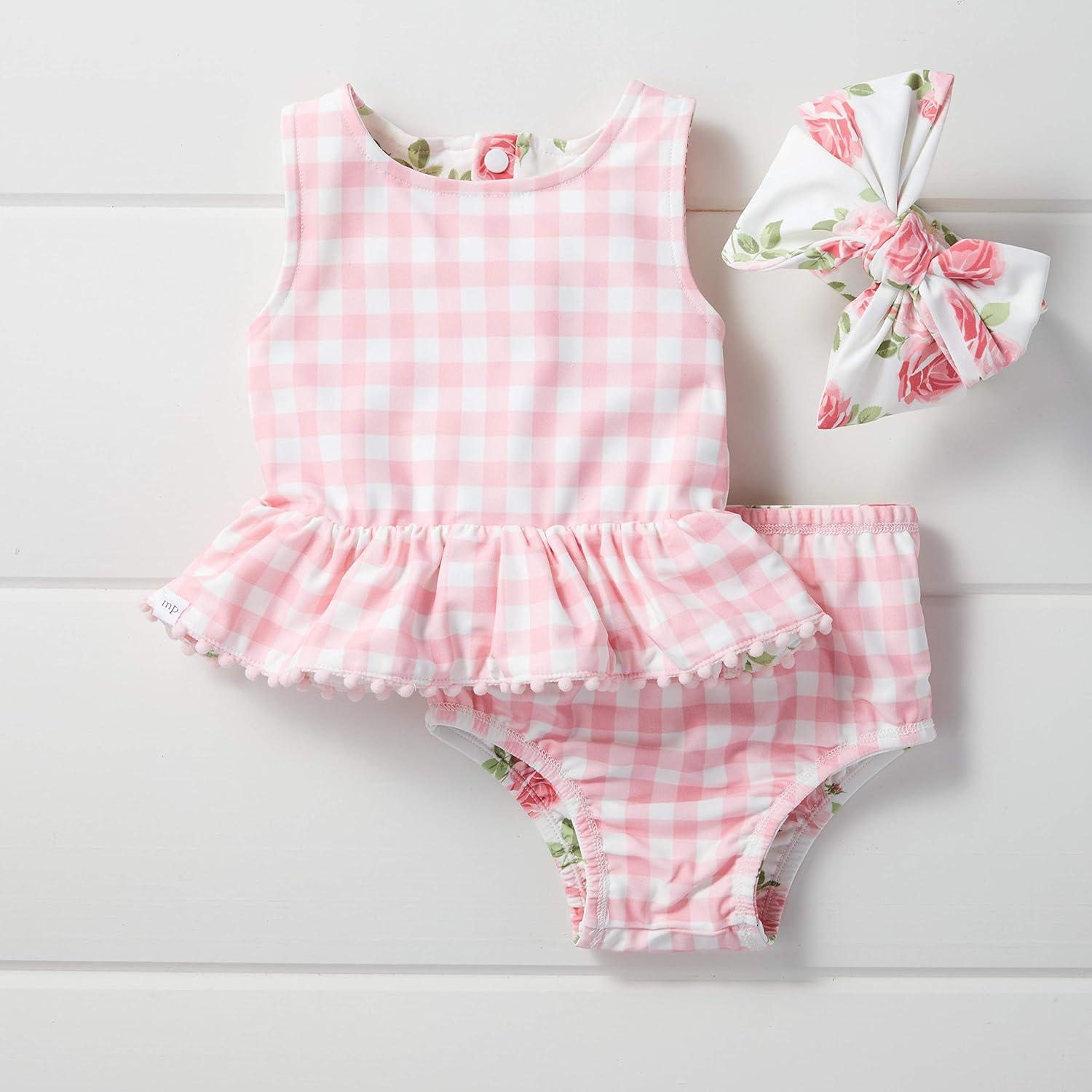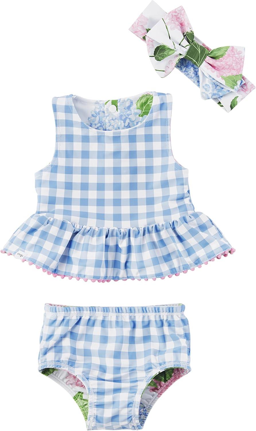 Mud Pie Girls Reversible Swimsuit & Headband Set(Hydrangea/Gingham)