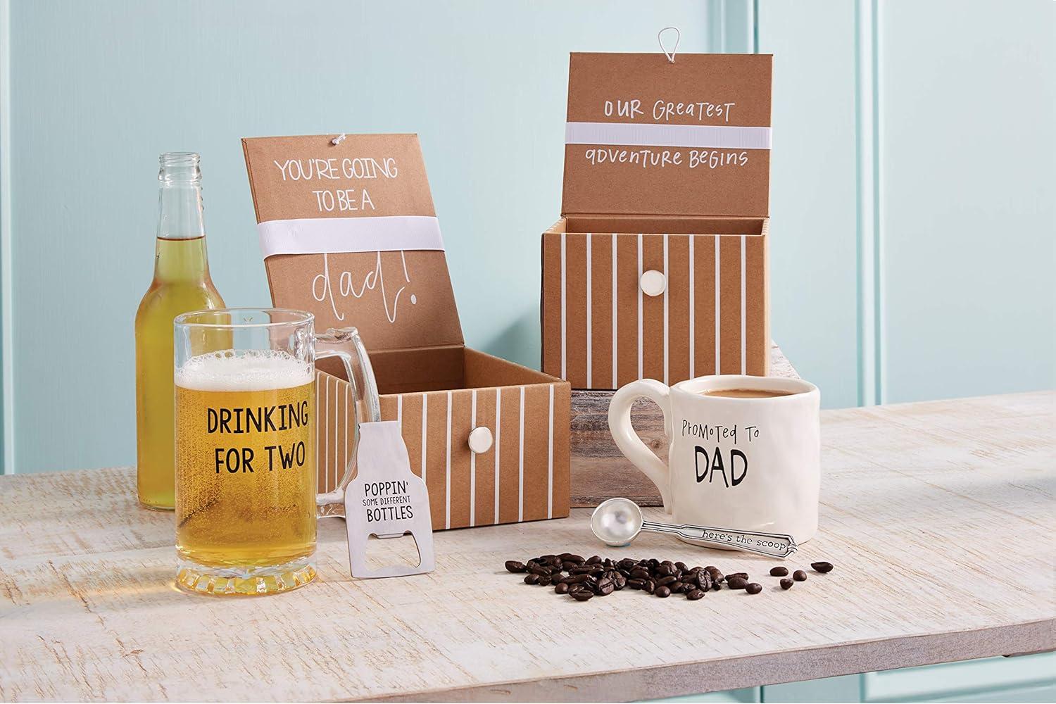 2-piece set. Surprise the Dad-to-be! Printed glass beer mug arrives in printed paper wrapped gift box with printed metal bottle opener.