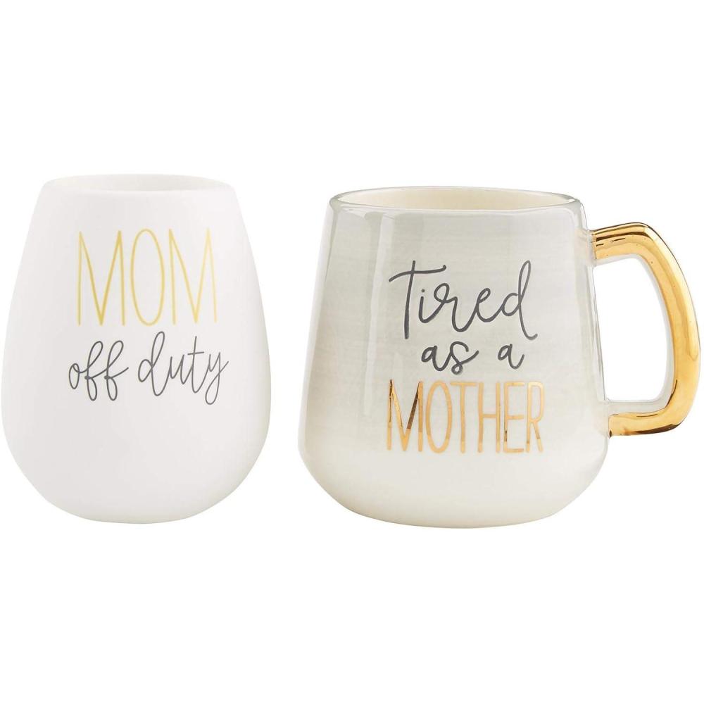2-piece set. Ombré ceramic mug with foiled sentiment pairs with silicone sentiment wine glass.