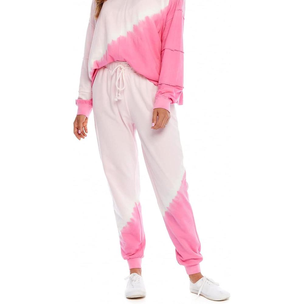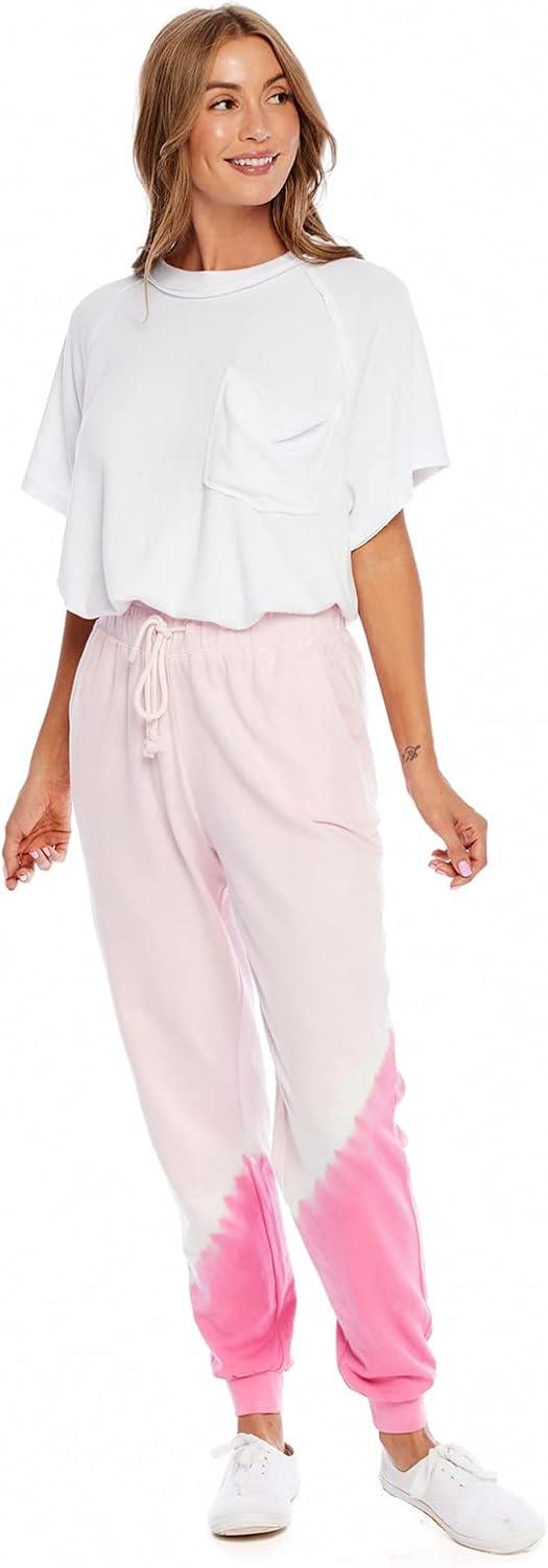French terry joggers feature custom tie dye patterns, elastic waistband with drawstring, front pockets and rib binding details. Inseam measures approximately 25 1/2″ on size small.