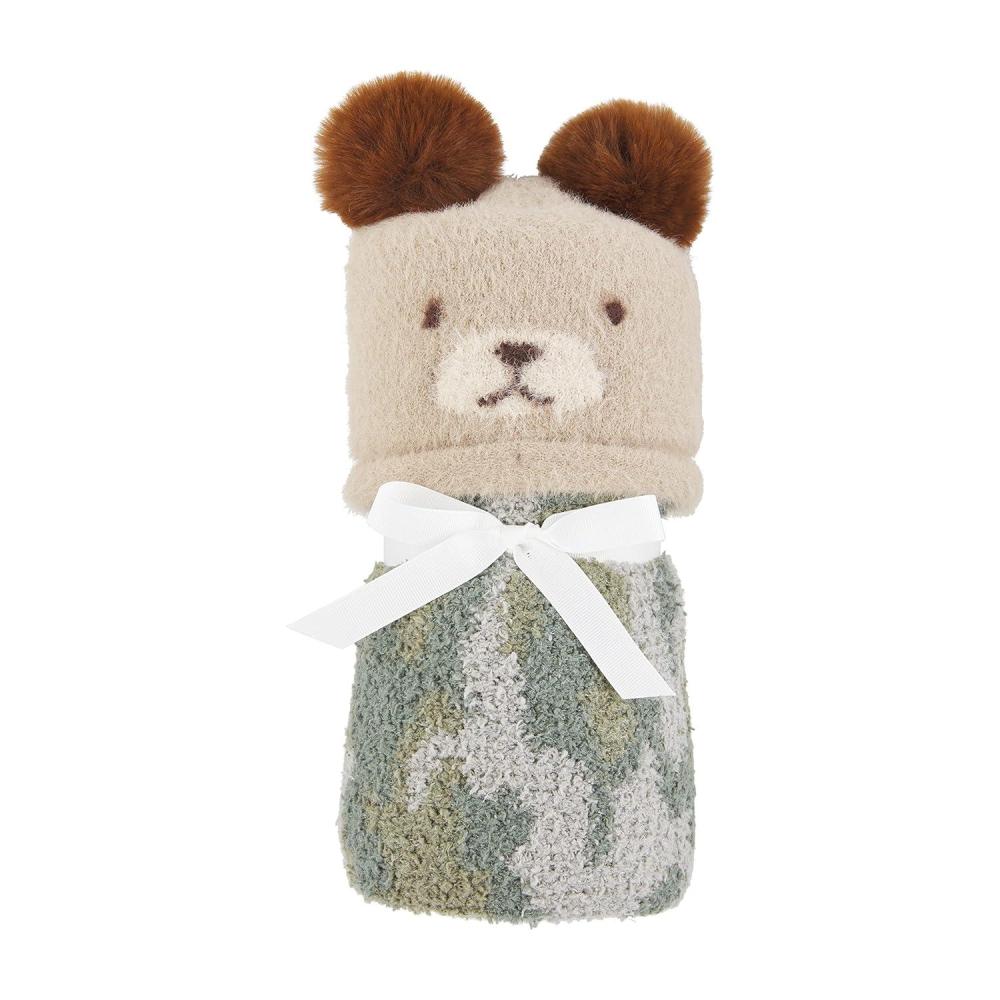 This chenille bear hat and blanket set makes the perfect baby shower gift! The two piece set comes with a soft chenille brown bear hat. The hat is wrapped around a green camo blanket. This set is perfect for baby's first baby's winter season to stay warm. The hat is sized 0-6 months.