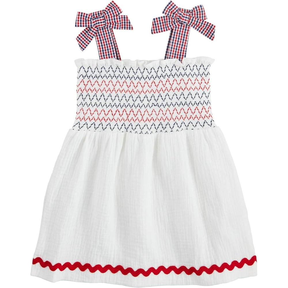 This charming smocked cotton gauze dress is a delightful addition to any wardrobe, offering a perfect blend of comfort and style. Crafted from soft, breathable cotton gauze, this dress ensures a lightweight and airy feel, making it ideal for warm weather outings. The dress is adorned with playful gingham bow shoulder straps, adding a touch of whimsy and a pop of classic pattern to the overall design. The ric-rac trim hem provides an extra layer of detail, enhancing the dress's visual appeal with its wavy, textured finish. Whether you're attending a casual picnic or a summer garden party, this dress promises to keep you looking effortlessly chic and feeling comfortable all day long.