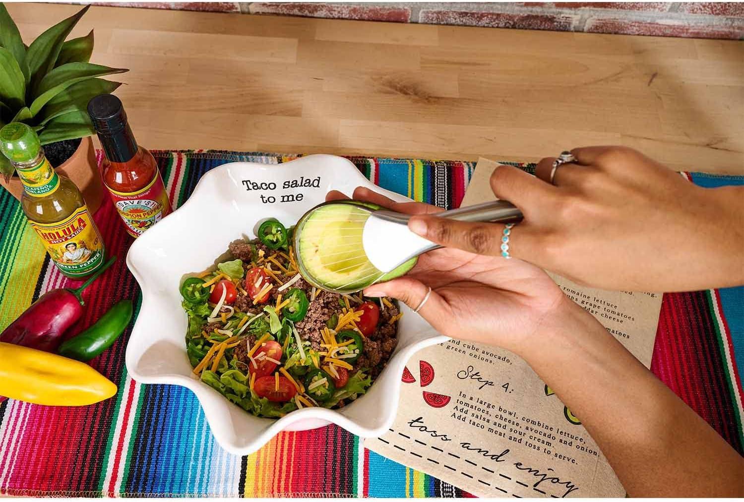 For all my taco salad lover, you are going to love our Taco Salad & Towel Set! The three-piece set includes a tortilla shell inspired taco salad ceramic bowl. This bowl comes with metal avocado slicer and a flour sack hand towel. bowl 5″ x 10″ dia | slicer 9 1/2″ | towel 26″ x 16 1/2″