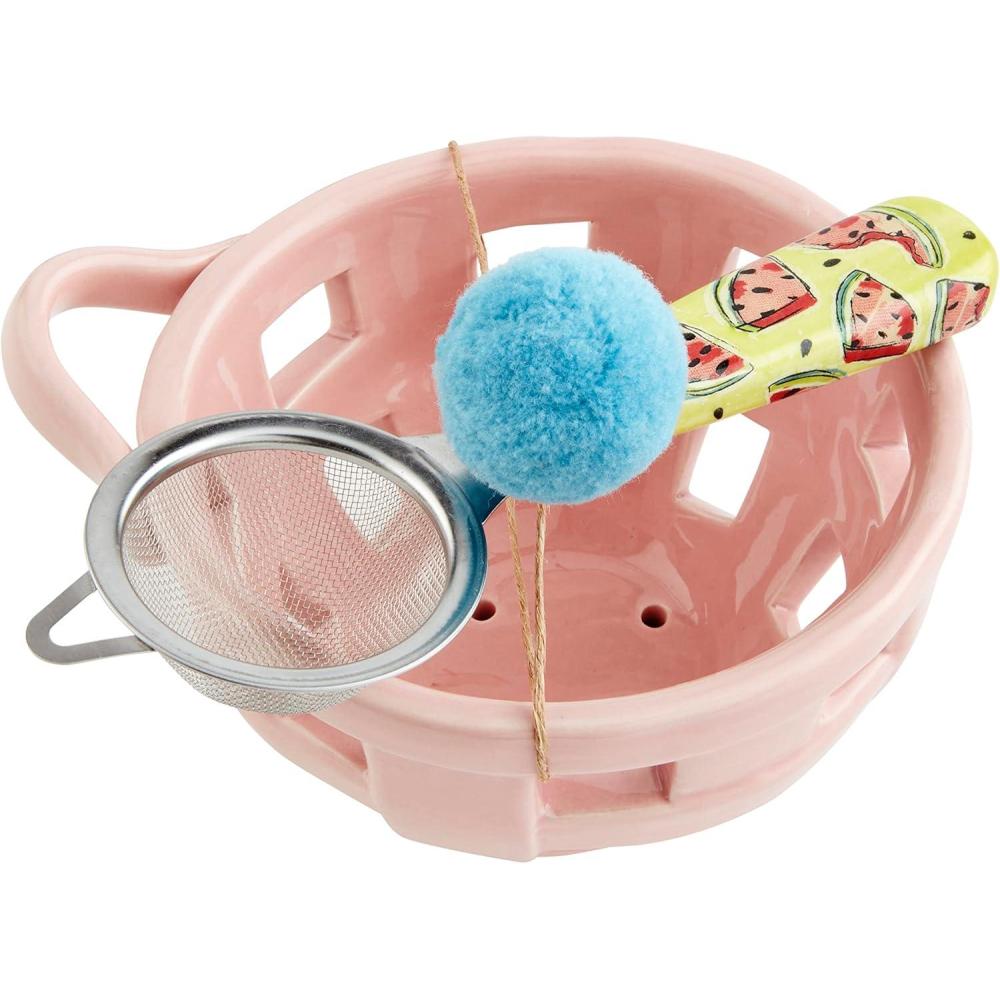 Add a pop of color to your home with our Colorful Berry Bowl Set. This adorable 2-piece set includes a blue Hand-painted ceramic berry bowl. Comes with stainless steel and ceramic strainer.
