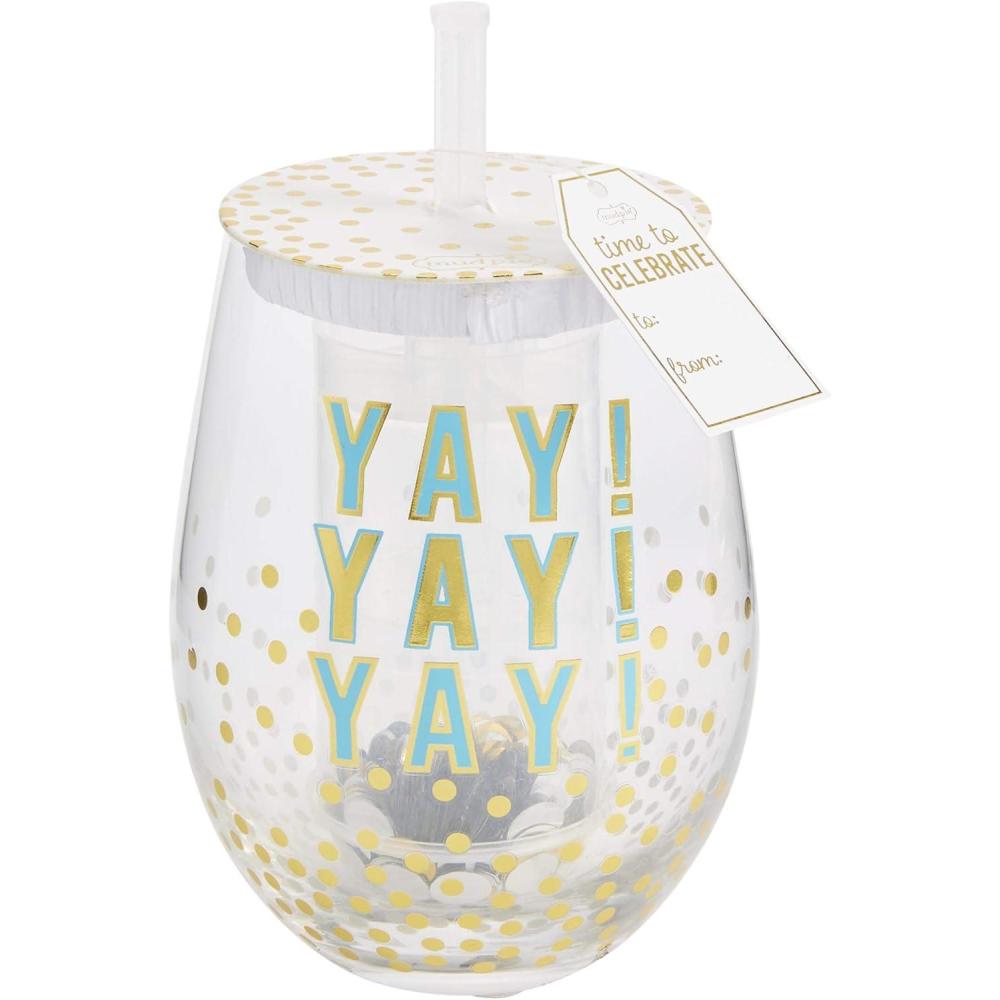 2-piece set. Stemless wine glass with foiled sentiment includes removable lid and celebration confetti popper.