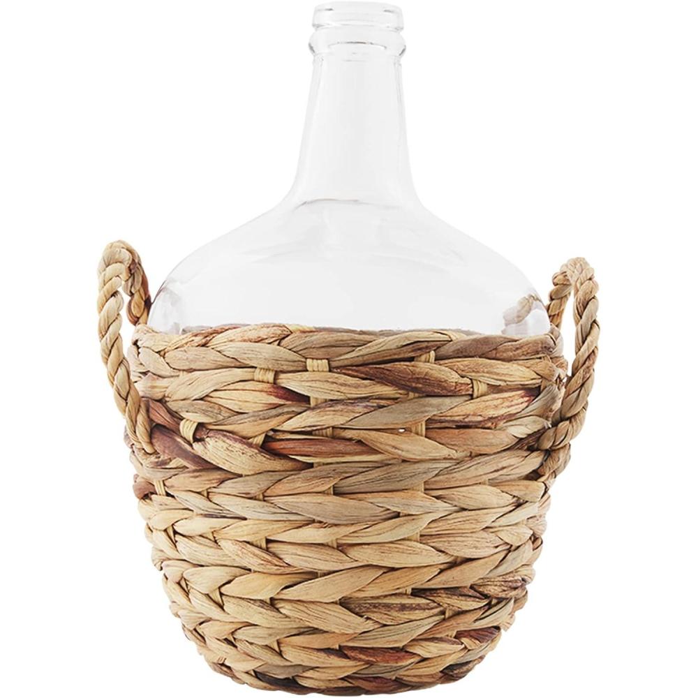 Large glass vase features hand-painted water hyacinth basket sleeve.