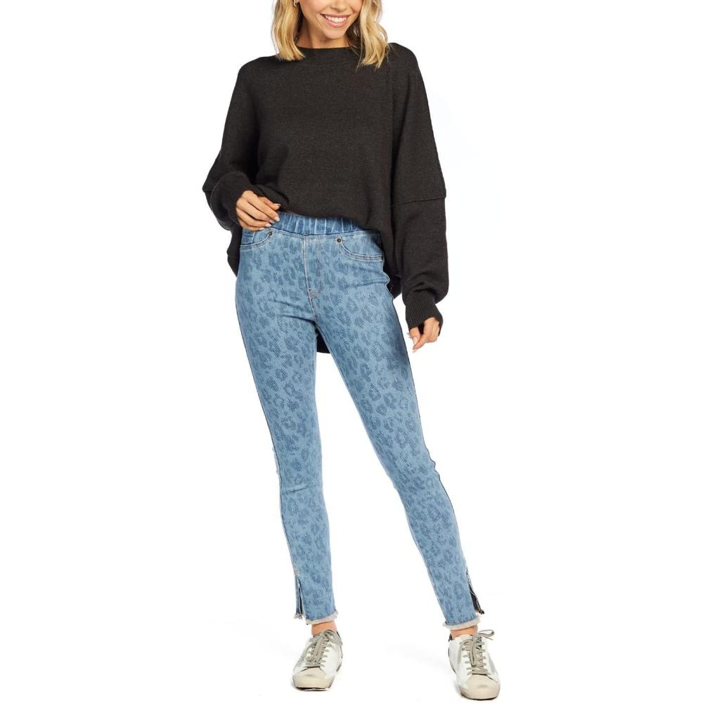 Our Jetta Zipper leopard jeans are designed for all day comfort. These pull on denim jeans features a blue leopard print that pairs well with our Dempsey swing tank top. The jeans also feature a raw edge hem with ankle zipper detail. The Jetta Zipper Jeans inseam measures approximately 29″ on size small.