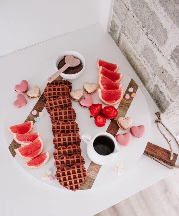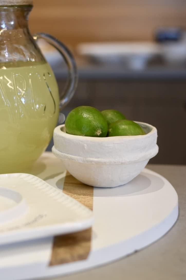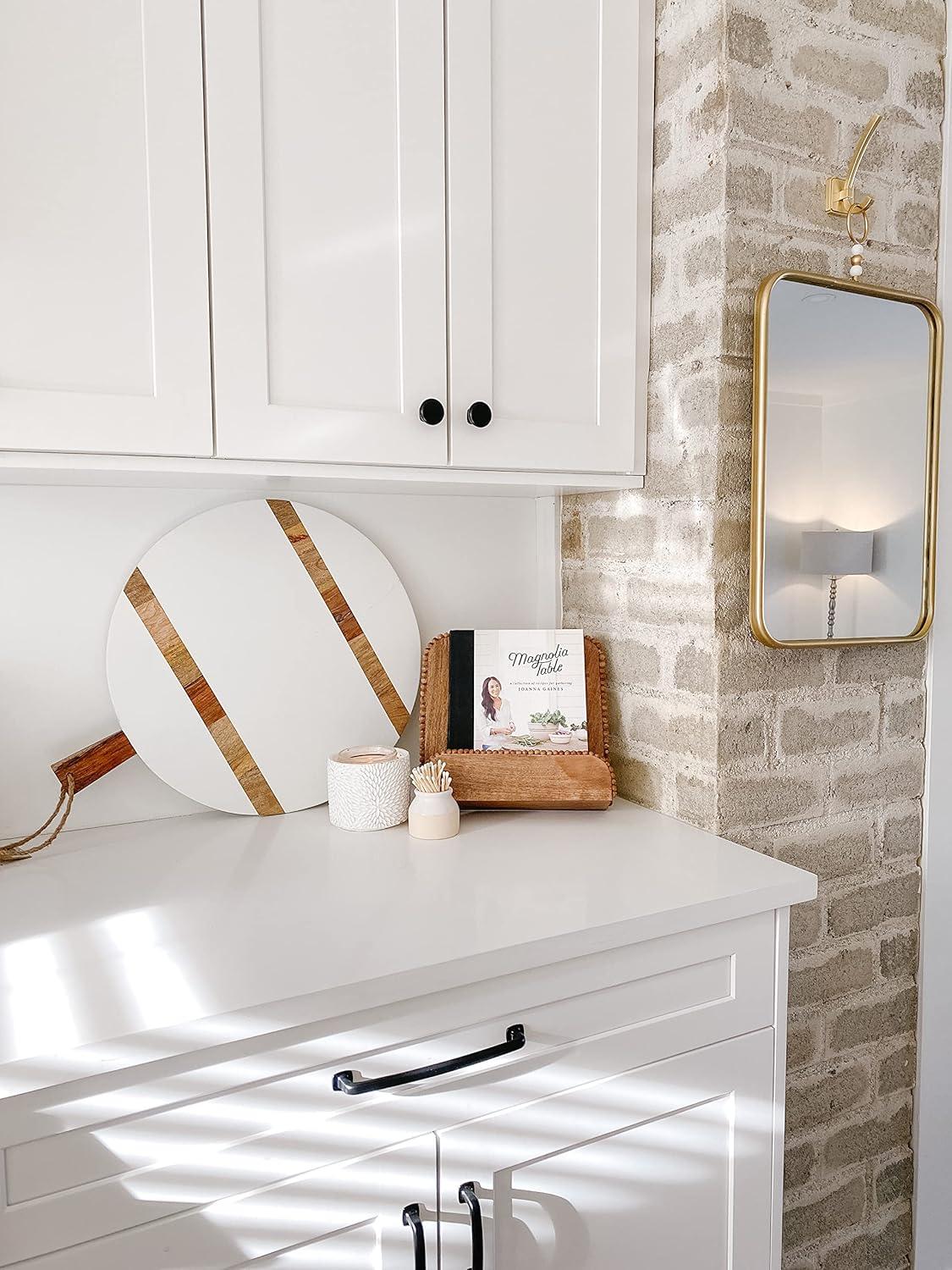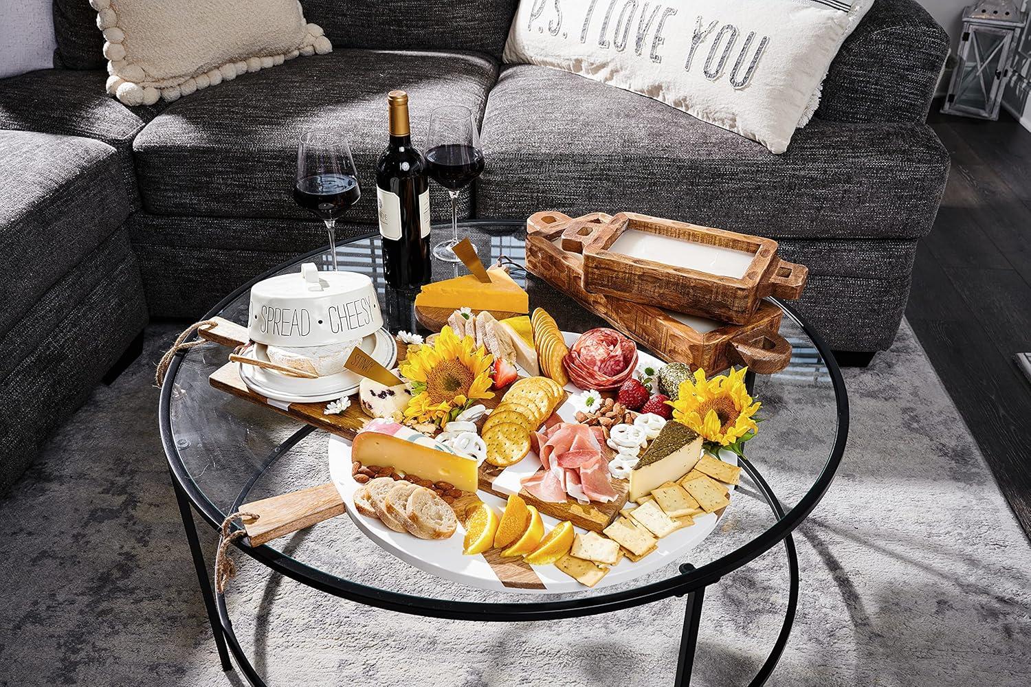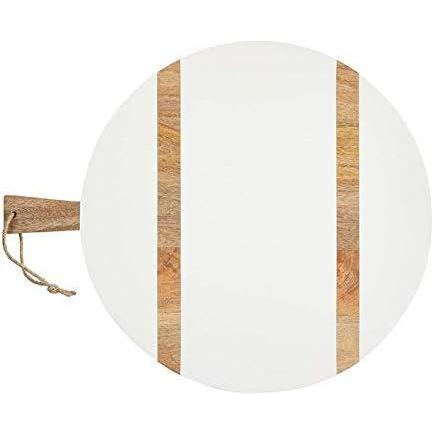 Our simple yet elegant large round white serving board is essential for your next cheese board. The large round paddle board features white and natural mango stripes. The serving board features a loop on the hand, making it easy to store. This serving board would make a great hostess or housewarming gift.