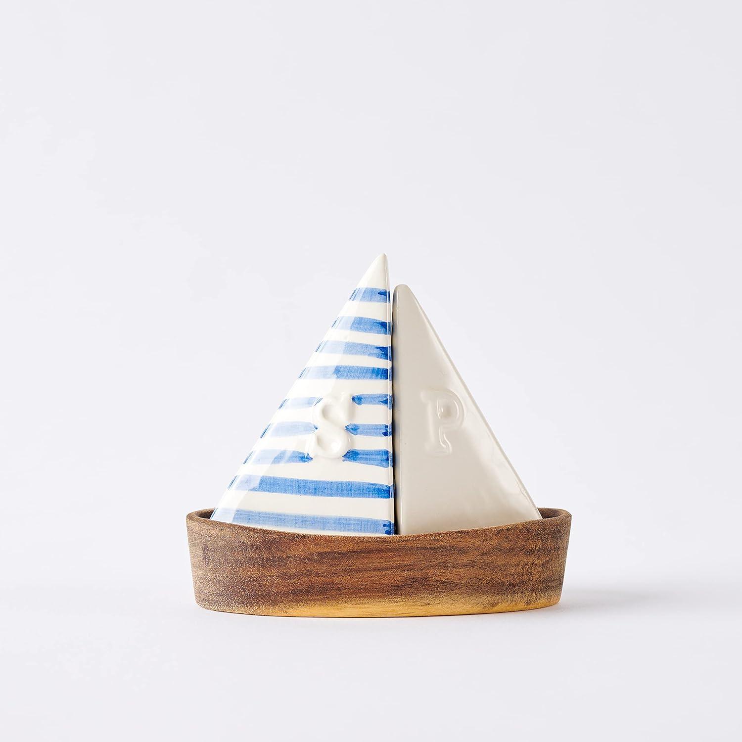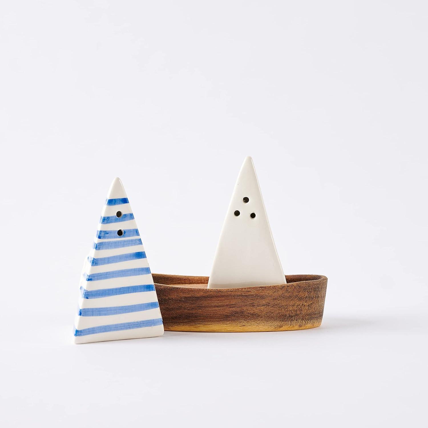 Two-piece set. Ceramic salt and pepper Shakers feature hand-painted watercolor stripes, embossed “s” And “P” Labels, serve as boat “sails” And rest in Mango Wood boat base.