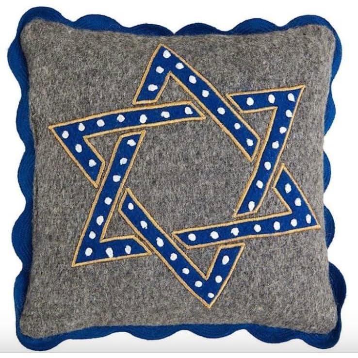 This pillow is carefully crafted with attention to detail, featuring a beautiful appliqued design of the Star of David