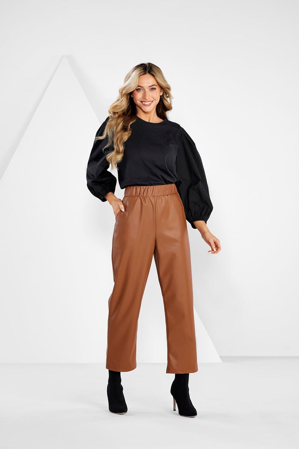 The Ballard Leather Pants are a stylish and versatile addition to any wardrobe. Crafted from high-quality faux leather, these wide leg pants offer a sleek and edgy look. The elastic waist ensures a comfortable and secure fit, while the faux pockets add a touch of sophistication. With an inseam measuring approximately 26 3/4″ on size small, these pants are designed to flatter and elongate the legs. Made from PU leather, they provide the luxurious feel and appearance of genuine leather without the high maintenance. Whether dressed up with heels and a blouse or dressed down with a casual top, the Ballard Leather Pants are sure to make a statement.