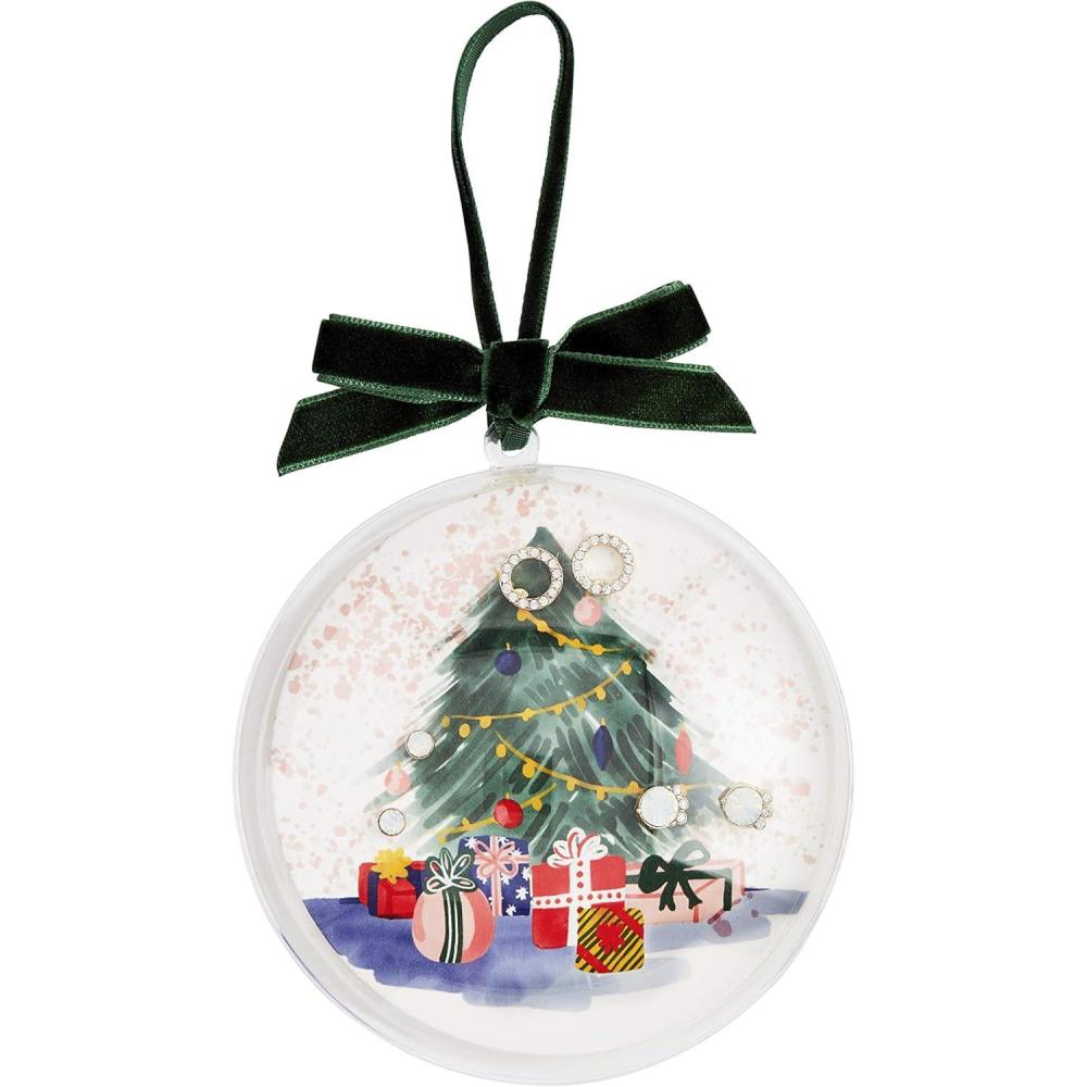 Three pairs of dainty earrings arrive in holiday ornament packaging with velvet ribbon hanger.