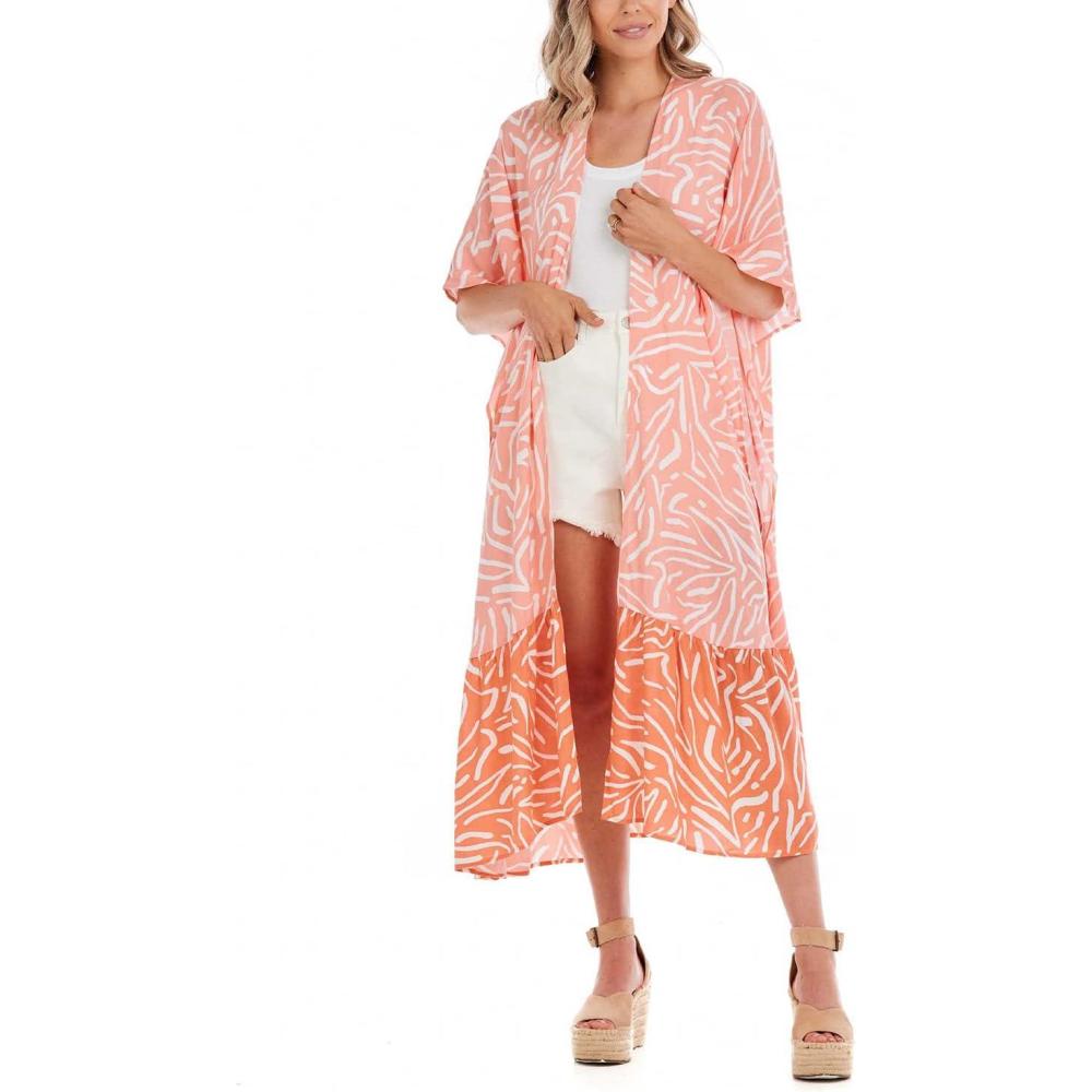 Elevate your summer style with this printed kimono! The viscose kimono features contrast prints and a flounce hem. One size fits most. Measures approximately 46 1/2″ from shoulder to hem.