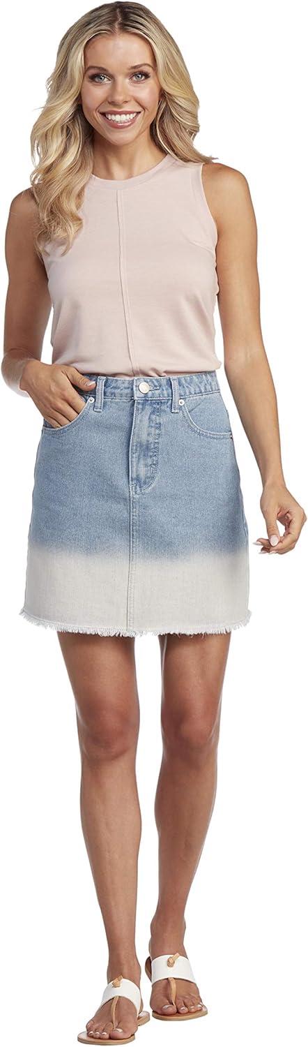 Ombré cotton denim skirt features front pockets, zip fly and fringe hem. Measures approximately 15 1/2″ from waist to hem on size small.